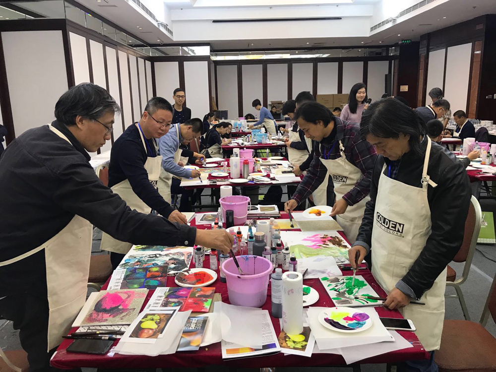 2018年新型画材技法应用研修班同桌中国美协水彩艺委会副主任李晓林,清华美院博士生导师顾黎明,中央美院教授陈琦