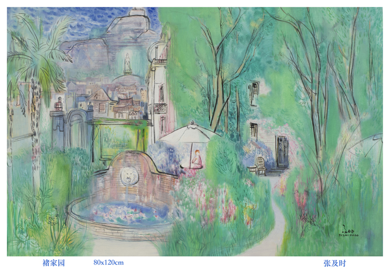 张及时在疫情期间创作的一幅《褚家园》,画面是在风景优美的花园中,一位女性在喝咖啡,惬意地享受户外春光。当时几乎所有市民都响应号召宅家抗疫,他通过构想描绘这样宁静美好的画面,表达对战胜疫情,早日回归户外享受美好春天的期盼。
