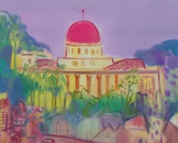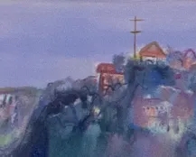 温柔的光晕。屹立在鼓浪屿东南端的覆鼎岩之上,被厦门人视为保护神的郑成功,也用了比较重的笔触勾勒突出。三一堂、天主堂、礼拜堂等鼓浪屿著名教堂的身影错落在建筑群中,都蕴含着画家祈祷一切安好的仁爱之心。植被簇拥环绕着日光岩,不