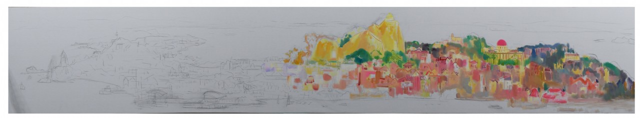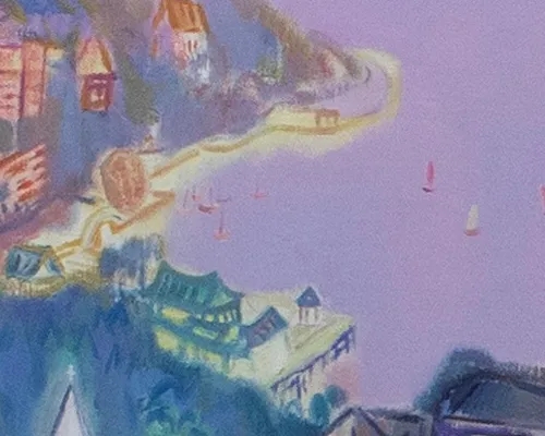 展开画卷,首先就能感受到张及时先生带给观者的一场色彩冒险。随类赋彩的设色方法,让金色、蓝色、粉色、橙色……在画卷中跳跃,重重叠叠却有层次可以依循。按照张及时先生的话来说就是“(偏)差一点就俗了。”一层一层细致地罩染,才能产生夕阳下天空和海面的清透质感。跳跃轻松的笔触伴着浪漫的风帆和飞行的白鹭,好似厦门一曲跳动的乐章。