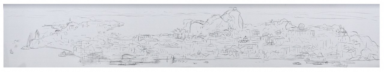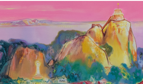 “站得远远地看,(鼓浪屿)就像一柄如意横卧在海中。”谈及自己新作的创想过程,张及时先生表示,2020年的疫情让他开始思考在画中添加祝福的意象。最容易让人一眼看见的要属画卷中间位置日光岩寺的观音像。背依着龙头山,观音菩萨散发着
